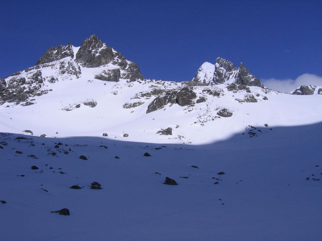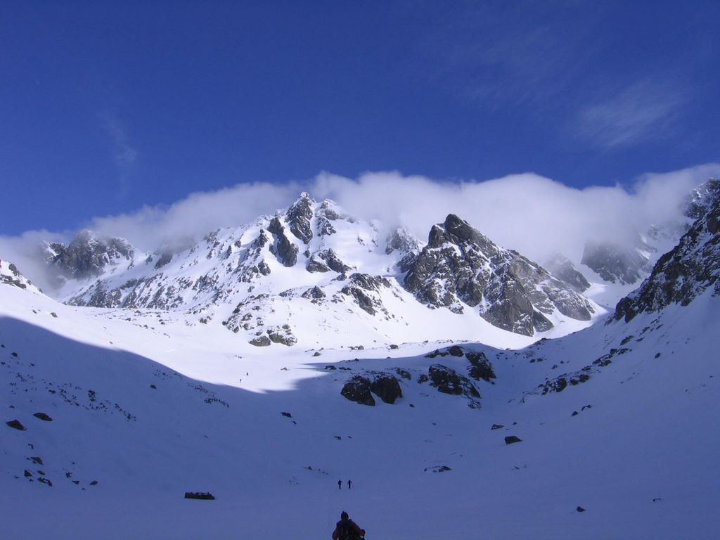 Cień Tępej kładzie się potężną plamą ciemnego błękitu na wypełnionej śniegiem dolinie.