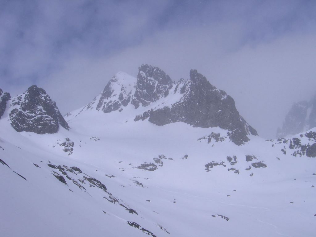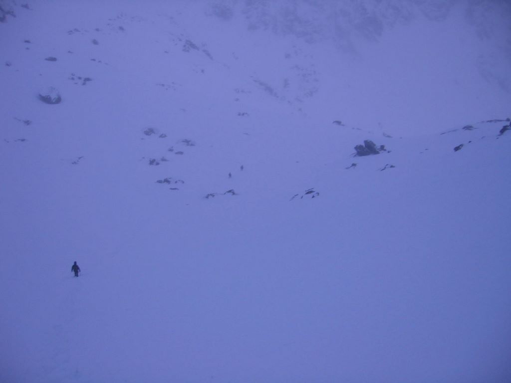 Pogoda zupełnie siadła. Przenikliwy, lodowaty, silny północy wiatr daje po kościach. Sypie coraz gęstszy śnieg, ni to suchy, ni to mokry, tnąc pod ostrym kątem. Resztki słońca uciekły gdzieś wysoko, wysoko ... a nas zaczyna oblepiać mlecznobiała przestrzeń. Widoczność znacznie spada.