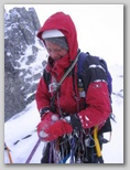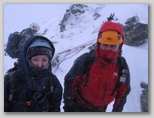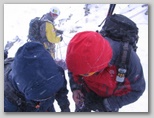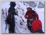 W pewnej chwili, gdzieś nad nami, miga nam czerwień kurtki Artura - jedzie ! Wreszcie. Za parędziesiąt sekund, gdy staje pośród nas, mówi co się stało. Otóż, przy tej pogodzie, gdy był już gotów do zjazdu, zamarzł mu zakręcany karabinek, wpięty do taśmy zjazdowej, którym miał wpięte auto. Co z tego, że to wyrób Petzla - wystarczyło dosłownie kilkanaście minut, by zamarzająca, lepka wilgoć zlepiła go na amen. Nie miał jak zjechać, nie mógł zejść - nie mógł zrobić nic wpięty autem w stanowisko z taśmy wokół bloku. Gdy tak bezskutecznie próbował otworzyć jednak swojego hms-a, w końcu przypomniał sobie o nożu - i przeciął taśmę auta, co go uwolniło.